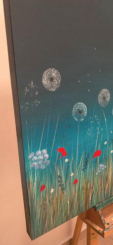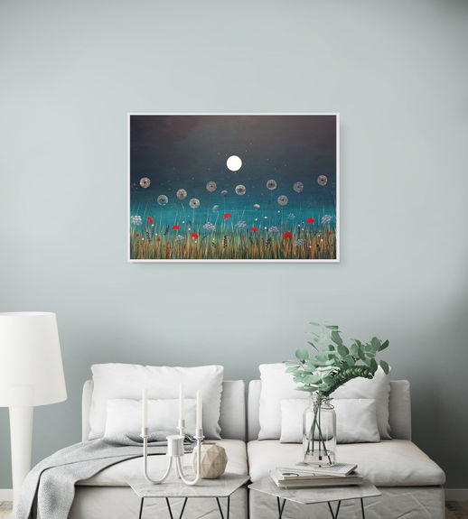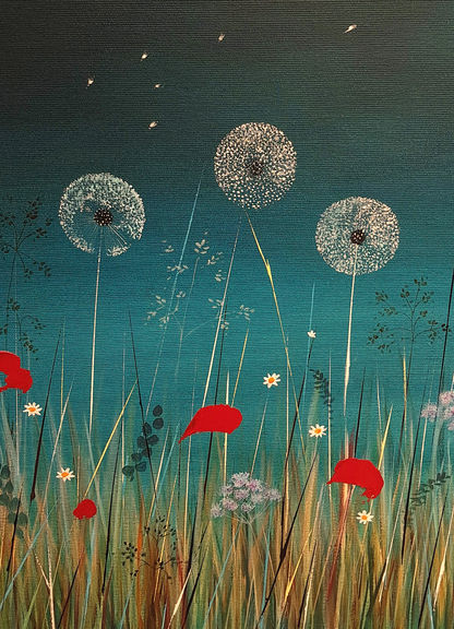 The moon floats above a vibrant meadow, casting a soft glow over a sea of wildflowers and tall grasses. Dandelion heads rise tall, gently scattering wishes into the approaching night—a symbol of release and transformation. The rich teal-blue sky evokes a sense of magic, while bold red poppies burst through the grass, adding energy and a quiet nod to remembrance, echoing memories of times past. This painting invites us to linger in a world between day and night, past and future, where colour becomes a language of feeling. It’s a gentle reminder that even in stillness, nature is always speaking.